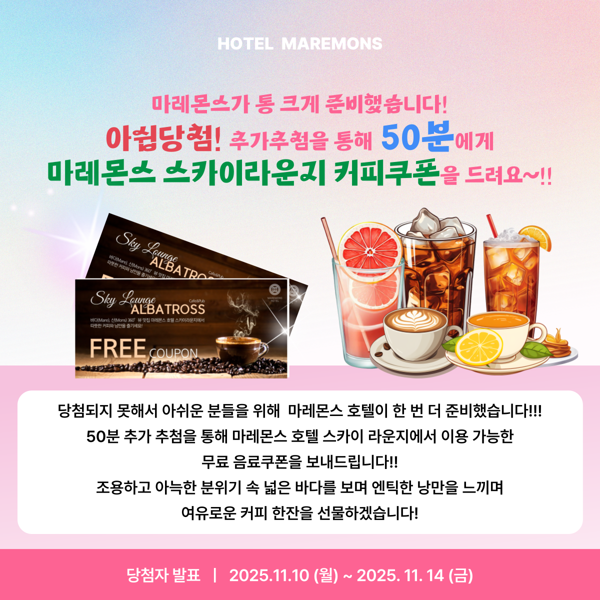 아쉽당첨(추가추첨)은 호텔 마레몬스 11층 스카이라운지 음료쿠폰을 제공하오니 많은 분들의 관심과 참여 부탁드립니다!!